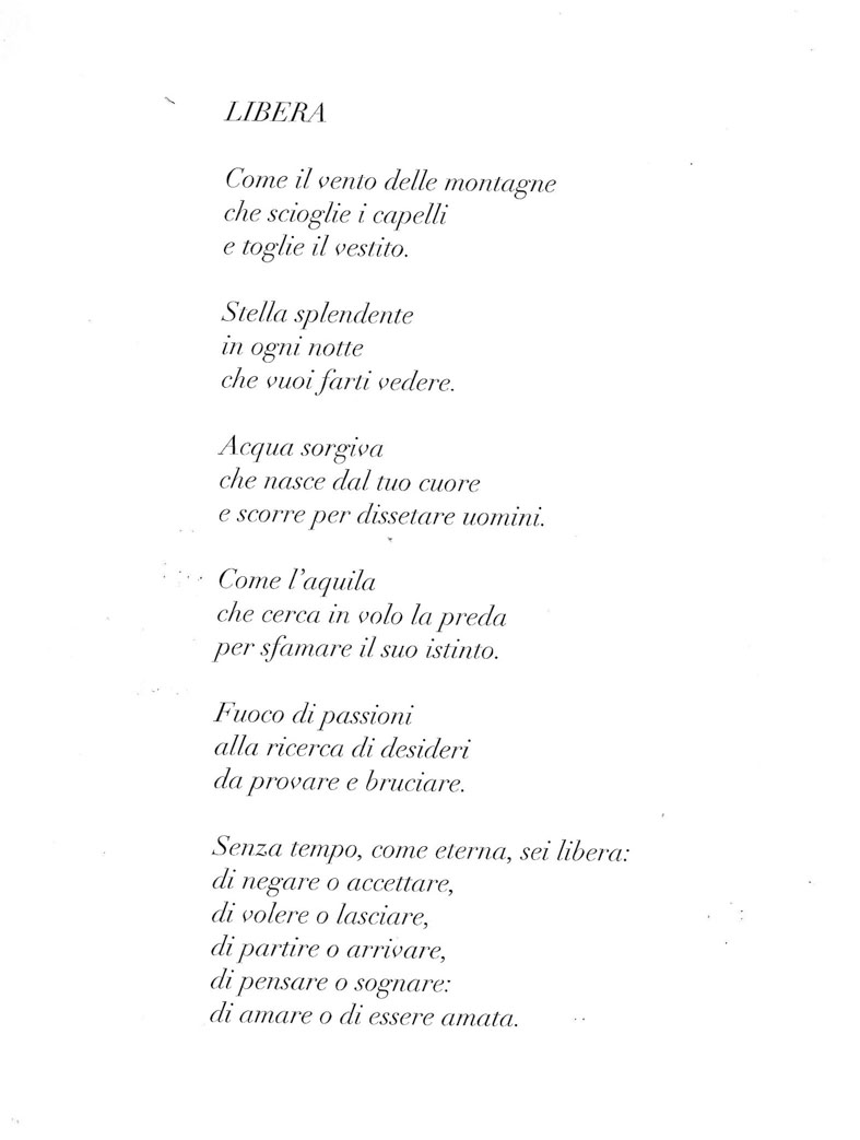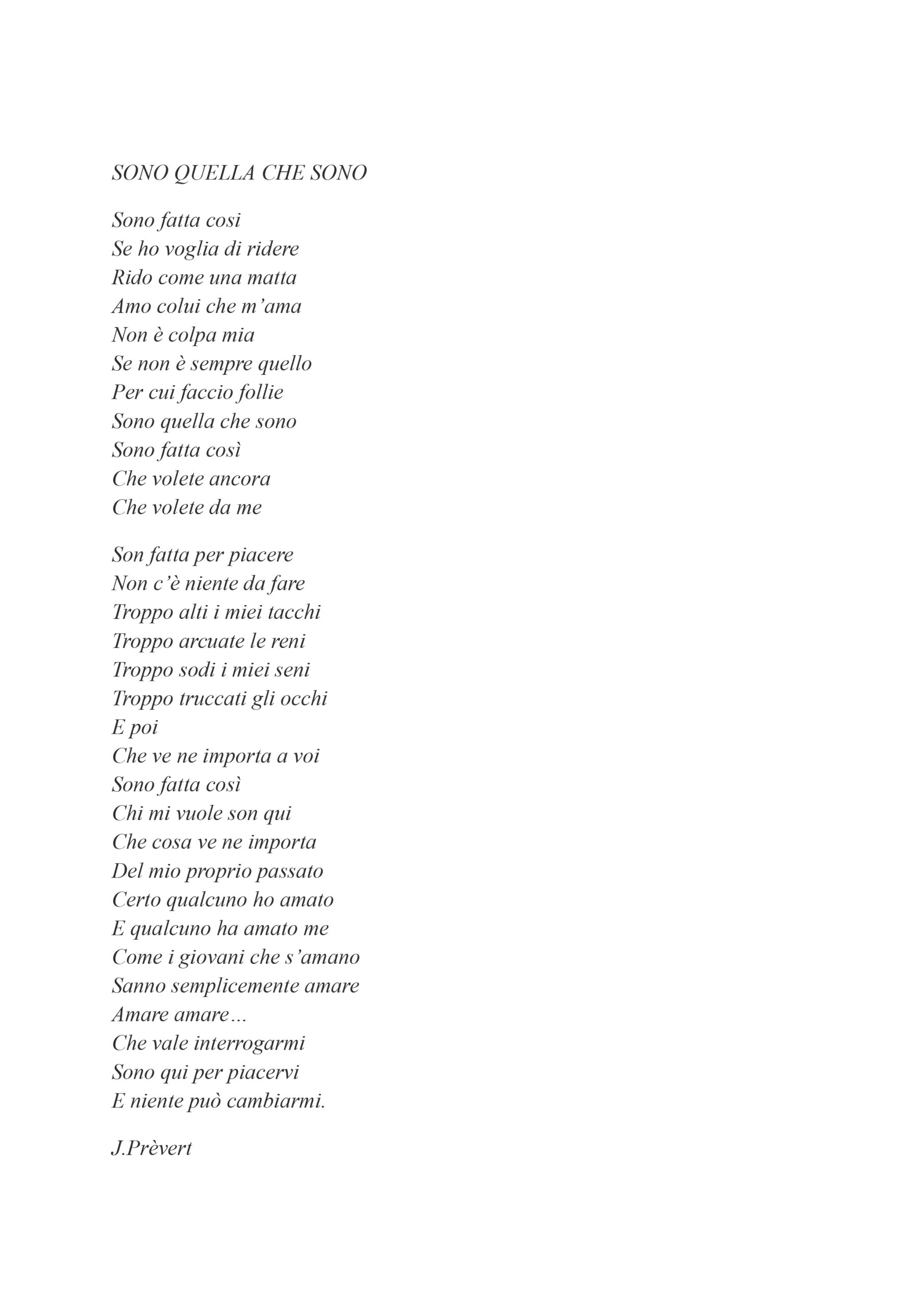Ho realizzato queste opere ispirandomi alla poesia d J. Prèvert che celebra la donna e la sua libertà’. Un poema che decanta la donna in tutta la sua femminilità’, identità, seduzione e amore. Nelle mie immagini mi sono concentrata sui colori caldi e sfumature morbide per evocare l’intimità’, la passione e la bellezza, mentre il bianco e nero che trasmette una certa nostalgia e malinconia, richiamando le emozioni contrastanti che spesso si trovano nelle relazioni amorose. Lasciamo parlare la poesia che descrive molto bene cio’ che voglio comunicare con le mie foto.