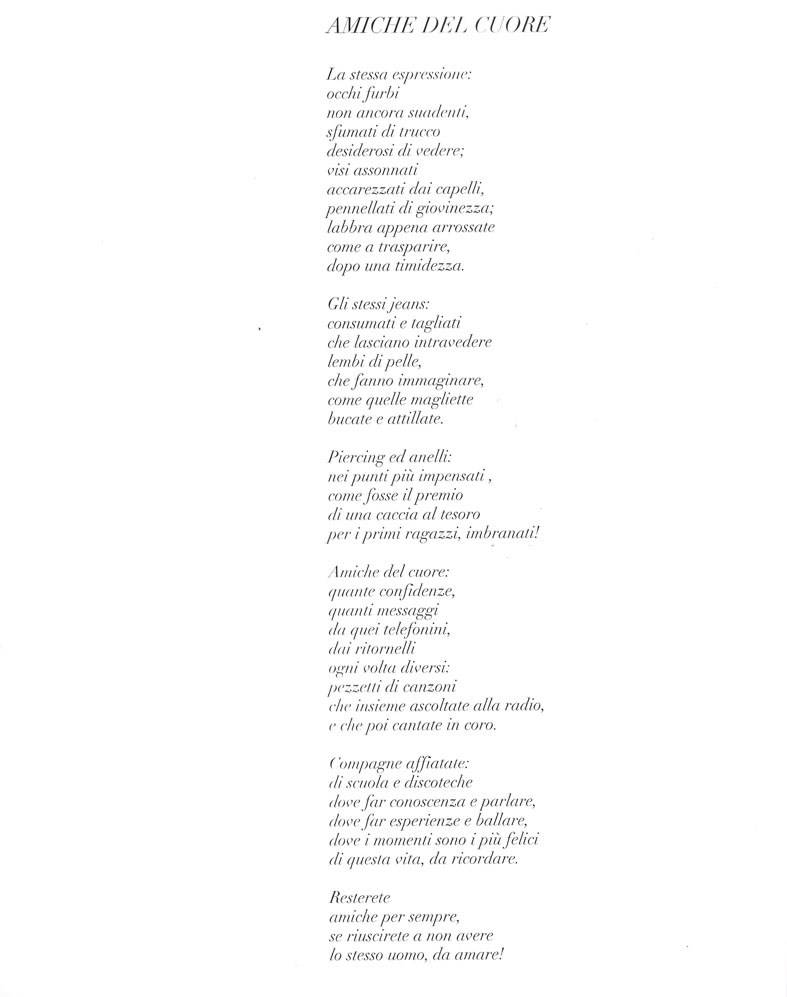 Ho creato un libro che celebra la bellezza e la diversità’ delle donne di varie eta’ attraverso una serie di immagini. Accanto a ciascuna di queste donne il poeta reggiano Luigi Iotti ha composto una poesia unica e toccante. Inoltre nel libro e’ incluso un CD contenente una canzone degli ARTISTI ITALIANI dedicata alle donne. Tutto il ricavato di questa iniziativa e’ stato interamente devoluto all AISM per la lotta contro la sclerosi multipla.